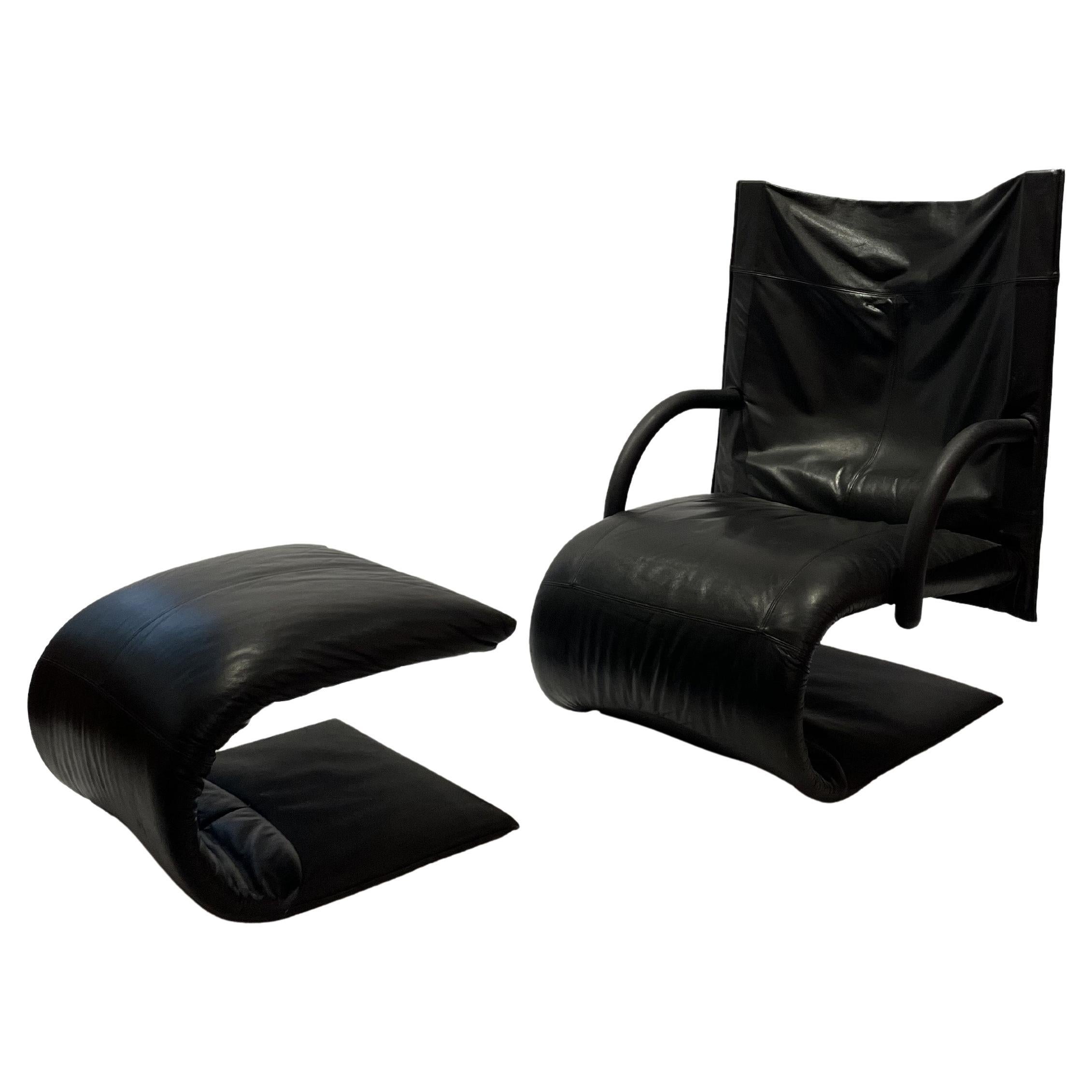 Postmodern Zen lounge chair and footrest by Claude Brisson for Ligne Roset, France 1980s. Rendered in black and white vegan leather upholstery with blac...