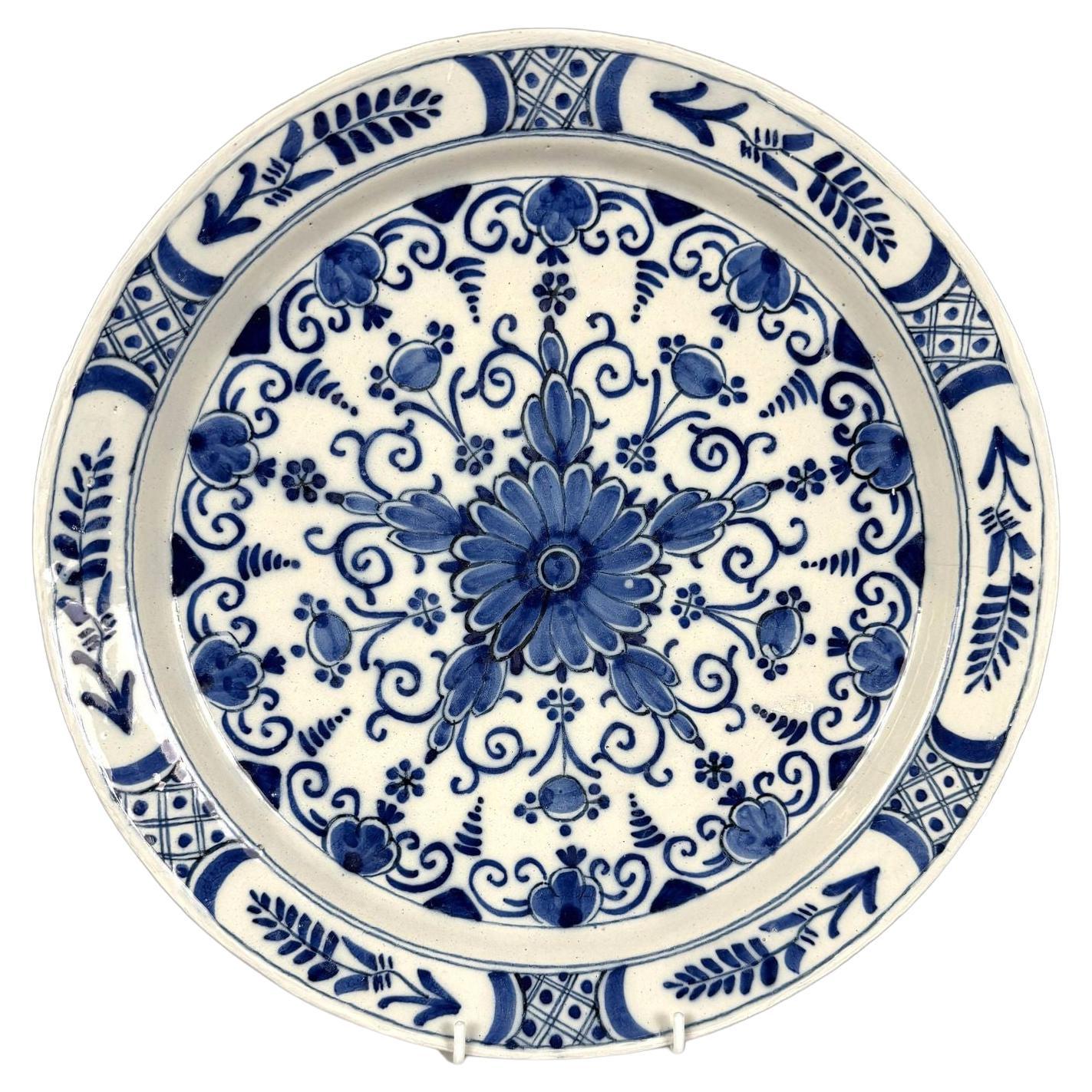 This large Dutch Delft large plate (diameter 13.75 in.) dates to circa 1780 and is decorated with a lively blue-and-white design centered on a bold floral rosette.