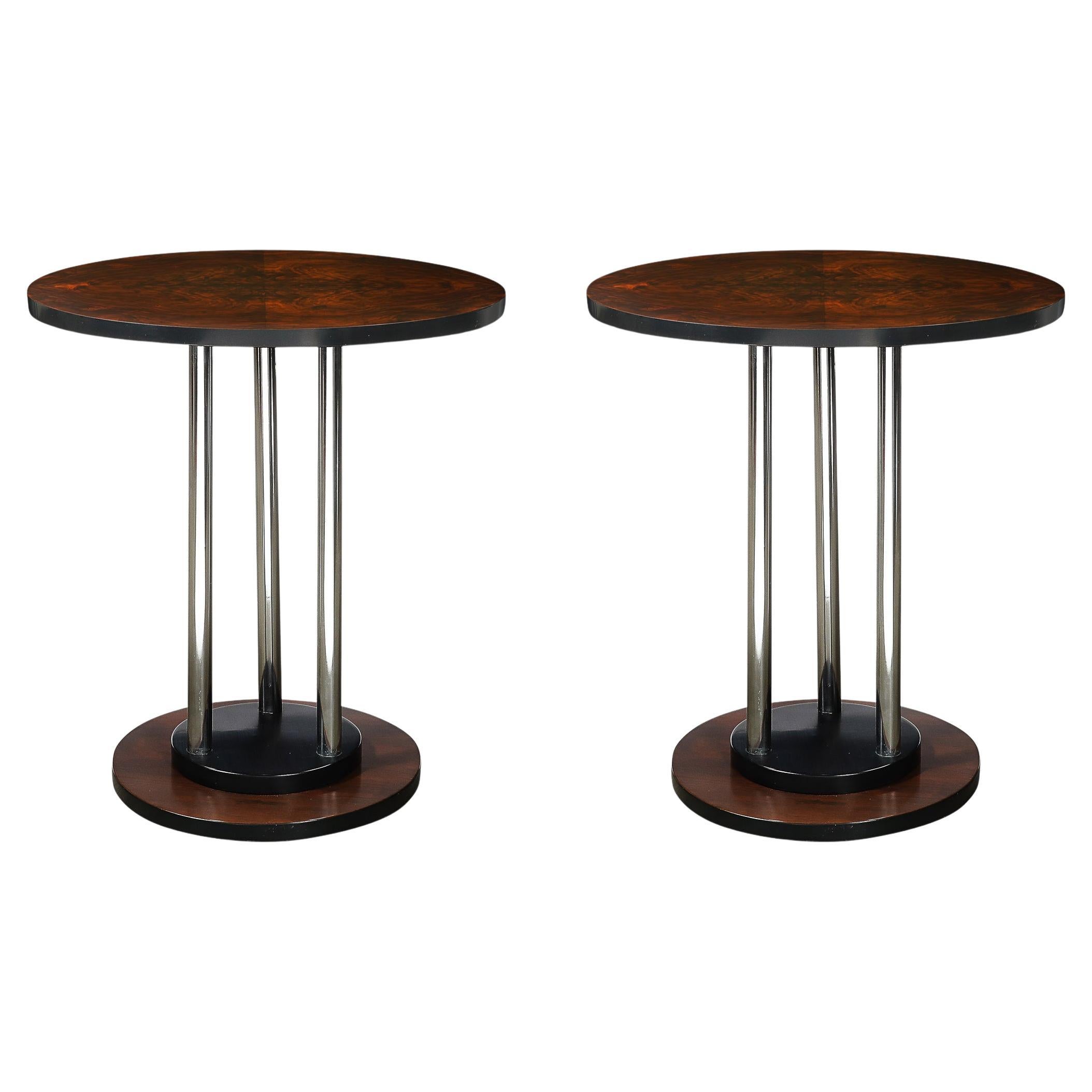 This pair of Art Deco Machine Age side tables, crafted in circa 1935, captures the sleek, geometric essence of the Machine Age while showcasing the fine craftsmanship of American Art...
