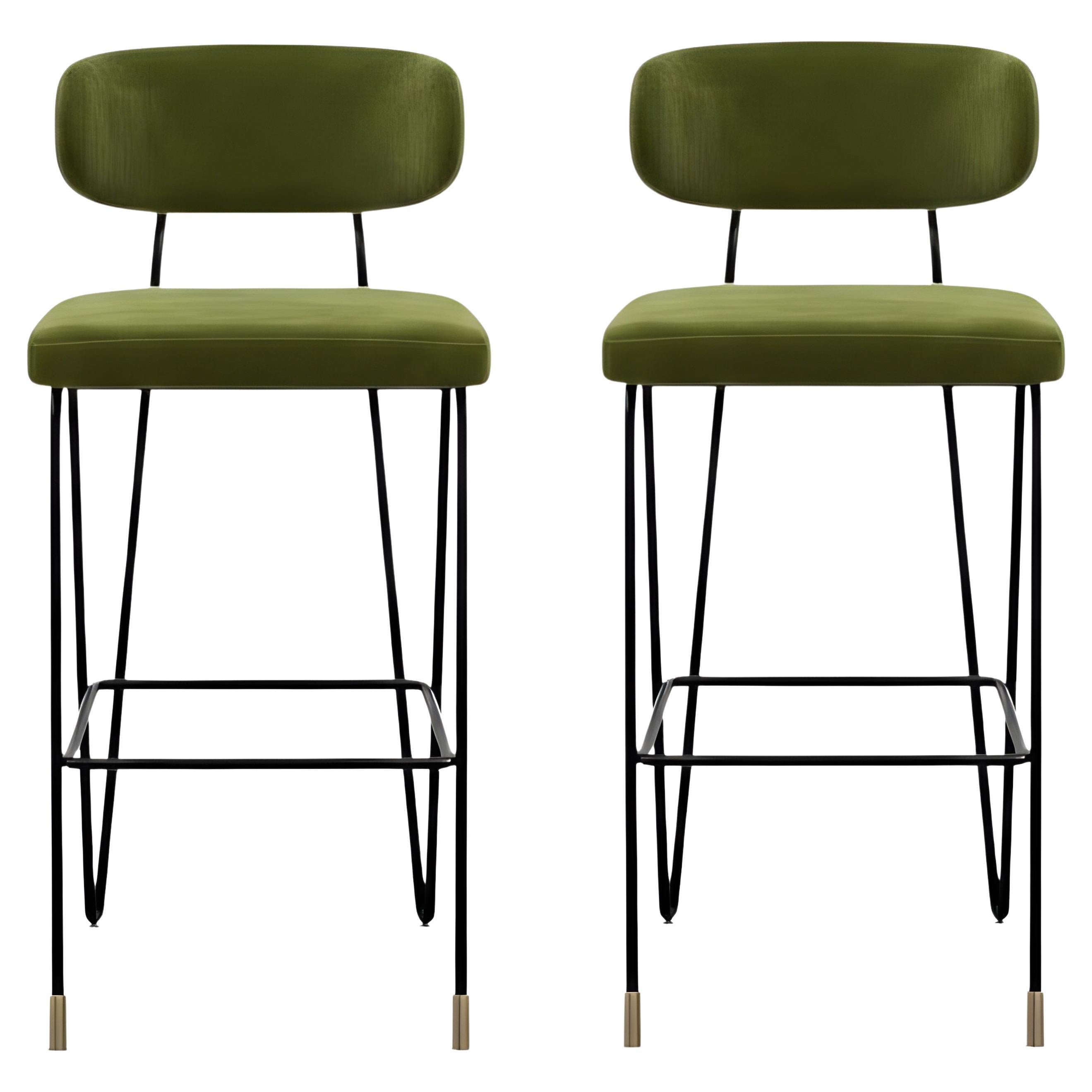Pair of Minimalist Barstools in Black Iron Frame and Brass Detailing