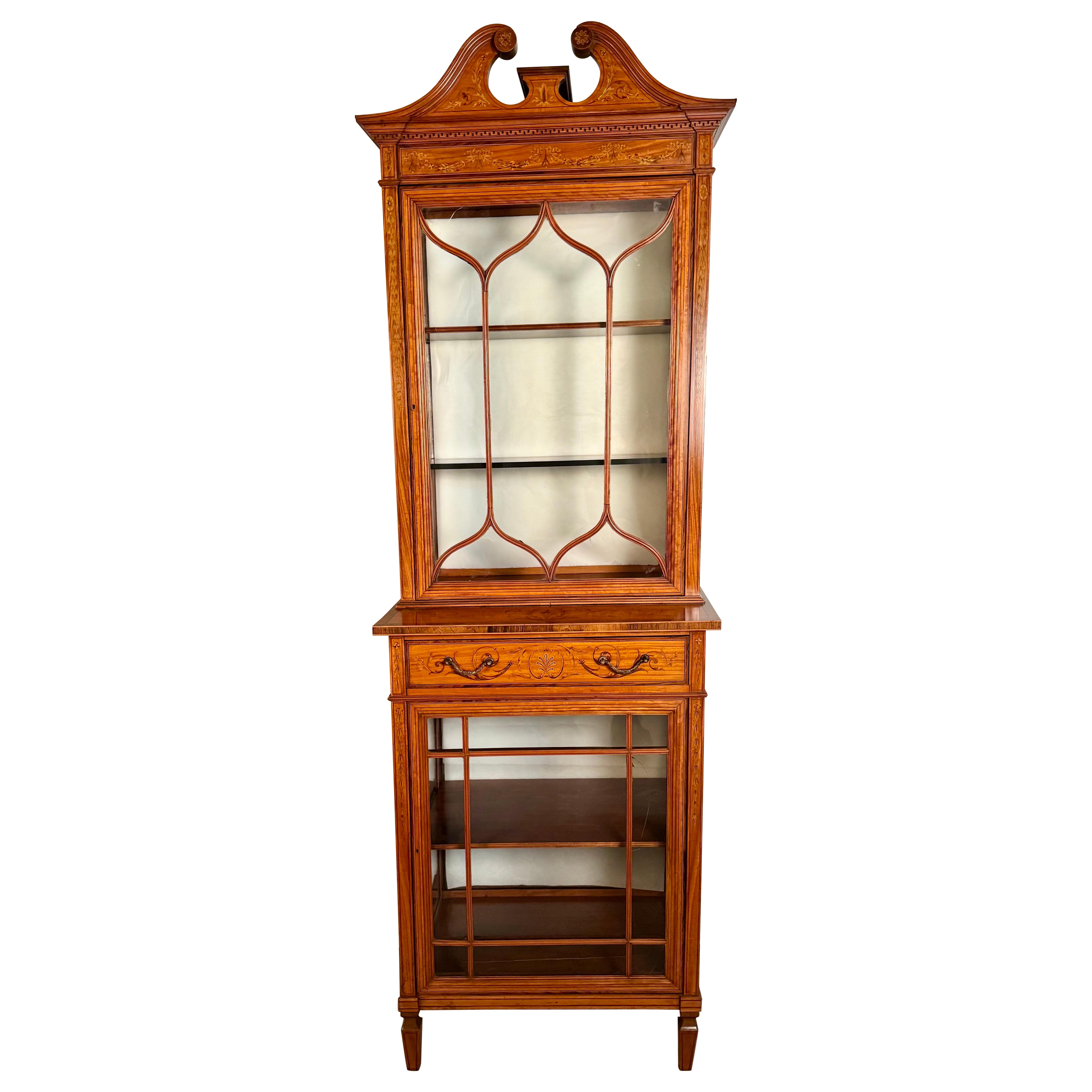 An exceptional late 19th century secretaire bookcase by Edwards & Roberts, the upper section with a pierced fretwork swan neck pediment with Greek key moulding. The twin astragal glazed doors open to reveal an adjustable shelved interior, having reeded canted corners. Constructed using the finest figured mahogany with satinwood and boxwood line inlaid detail. The lower section having figured mahogany top, banded in satinwood above a secretaire drawer depicting a central classical urn within a floral swags, enclosing six Satinwood drawers, six pigeon holes and a gilt tooled leather inset writing surface. The twin panelled doors again constructed from figured mahogany with boxwood, satinwood inlaid panels depicting classical urns within a floral border. Also having reeded canted corners and enclosing an adjustable shelve interior, resting on solid mahogany bracket feet.