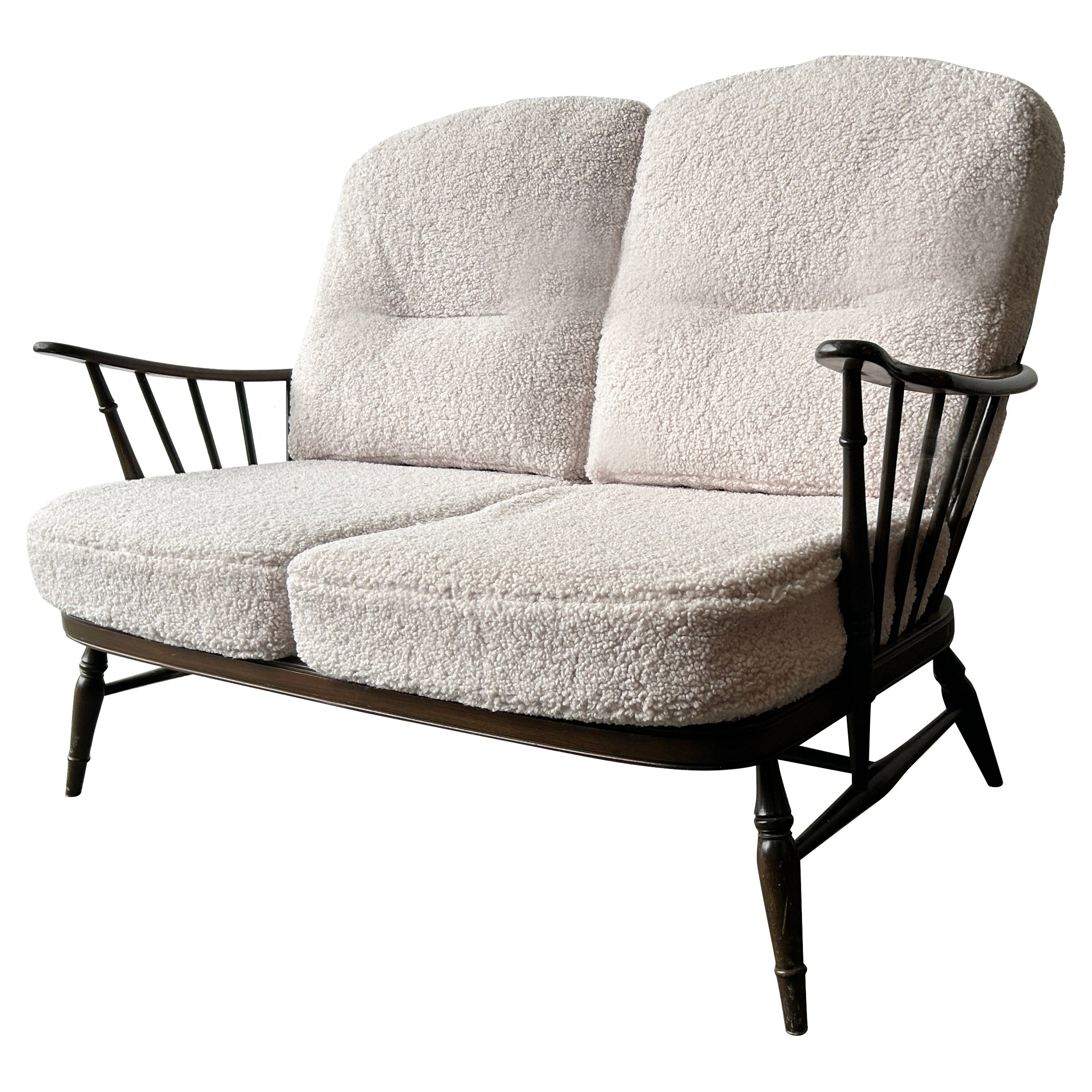 Two-seat “Windsor” Sofa by Ercol, newly upholstered in off-white boucle, from 1970s. Rare last edition wit...