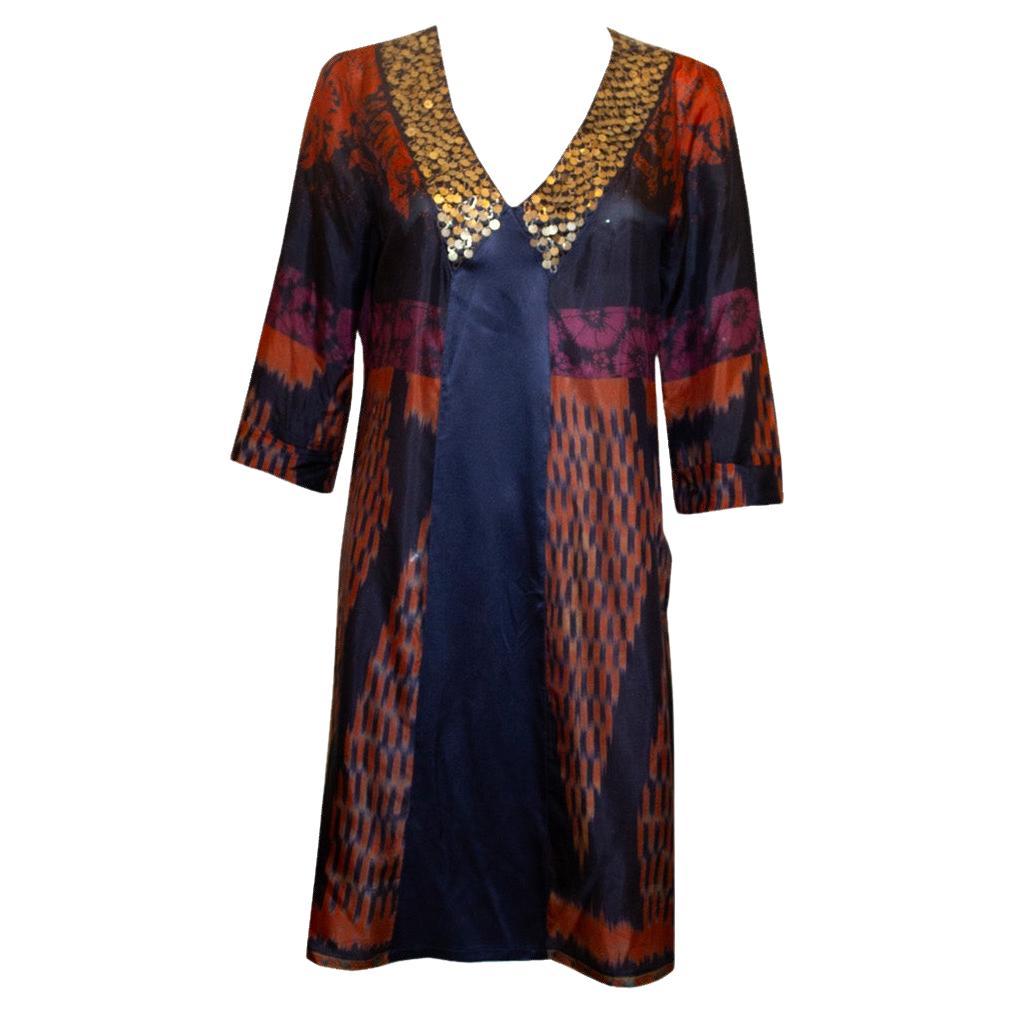 Etro mix print silk chiffon, peplum slip dress with acrylic/resin bauble bodice. Marked size 44. Scoop neckline dress with a single colorful acrylic/resin bauble at the center front ...