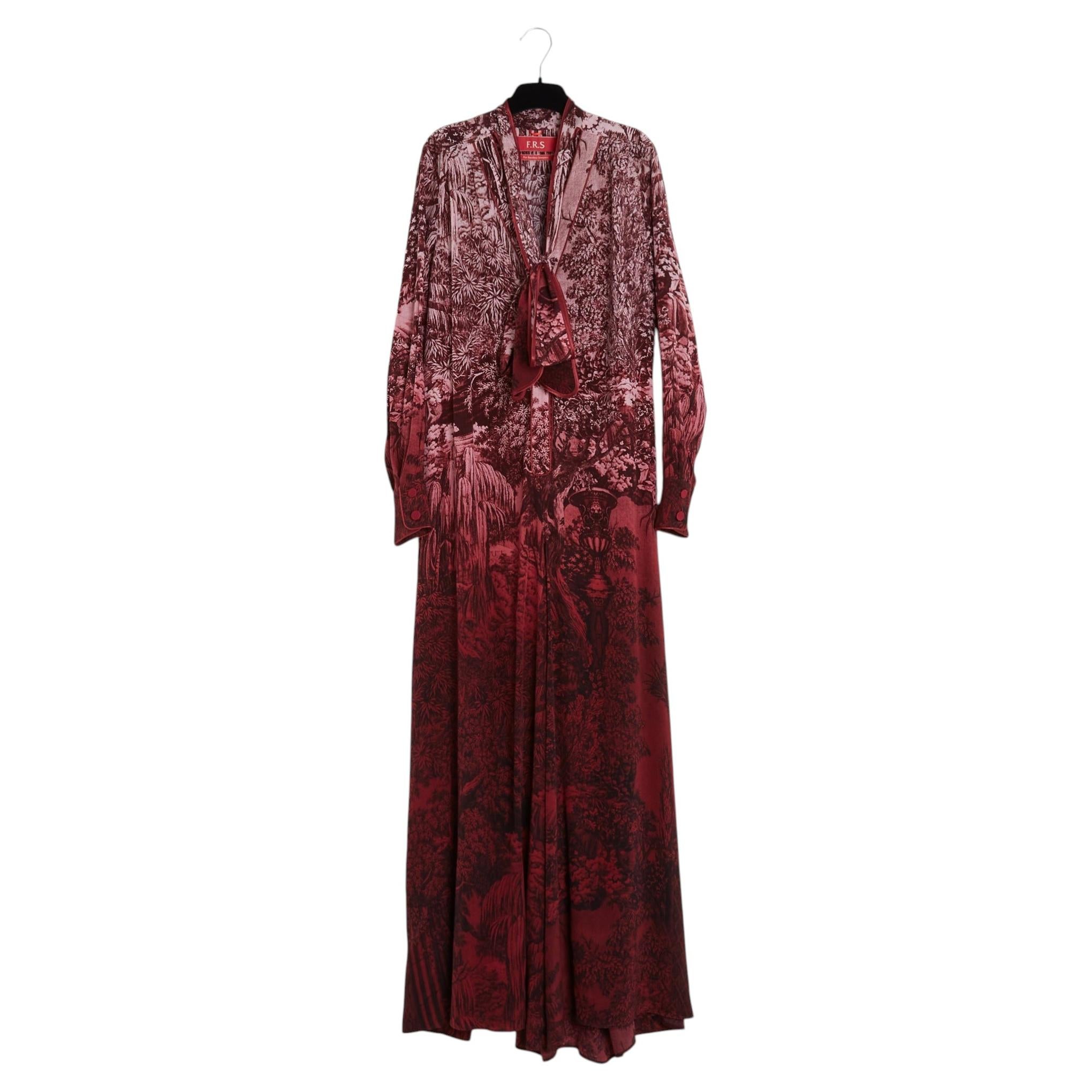 F.R.S. For Restless Sleepers jumpsuit, designed like a long dress, in burgundy silk twill trimmed with ribbon, V-neck with a lavallière collar extending to the waist with four concea...