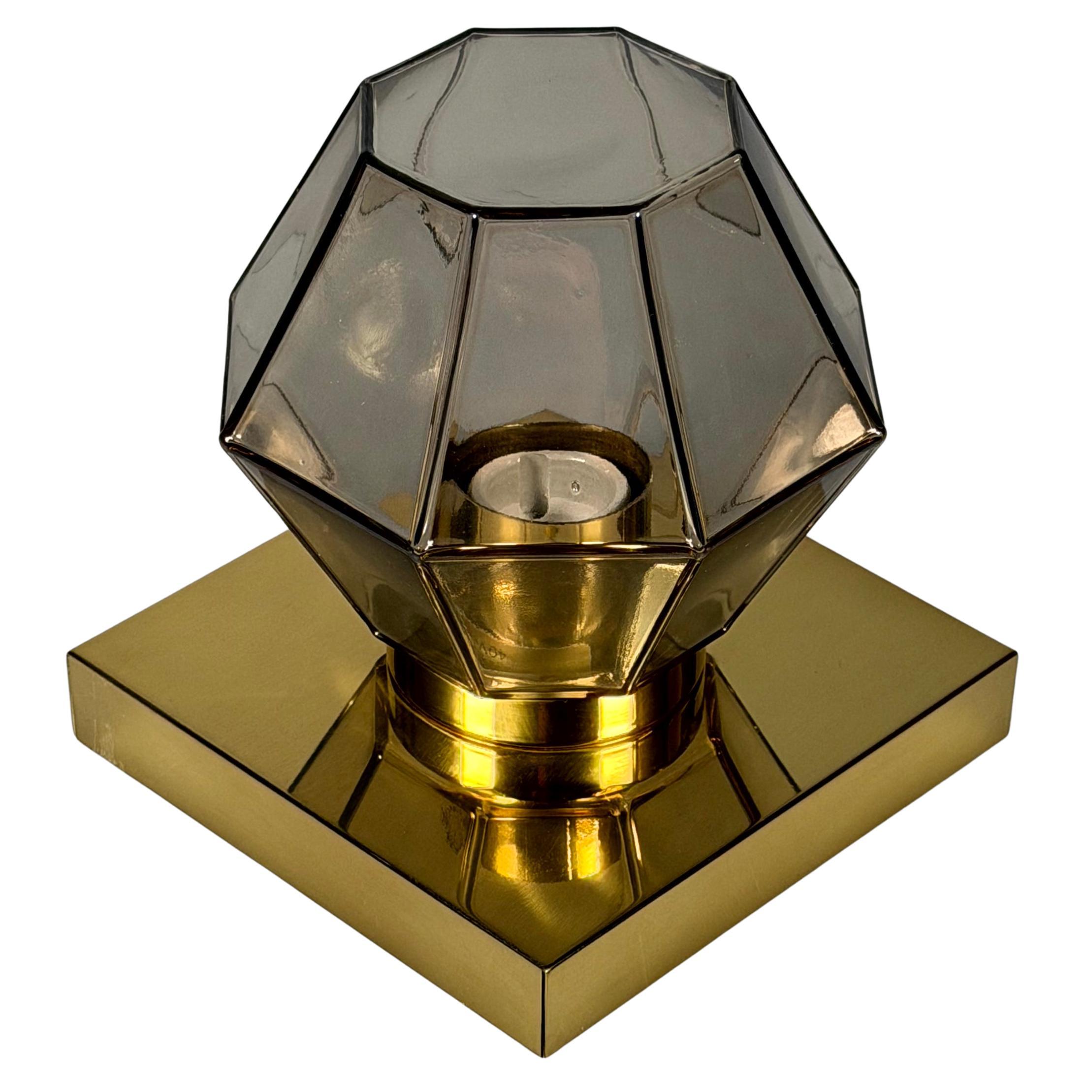 Vintage Midcentury Modern octagonally shaped, Minimalist German made clear glass with "iron" frame and lacquered polished brass base flush mount light fixture produced by Glashütte L...