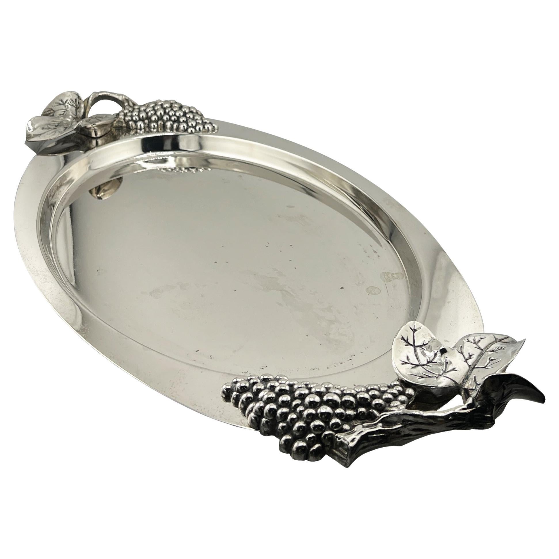 A classic Godinger silverplated oval serving tray featuring sculptural grape clusters and vine handles at each end, executed in high-polish silverplate. The form is elegant and time...