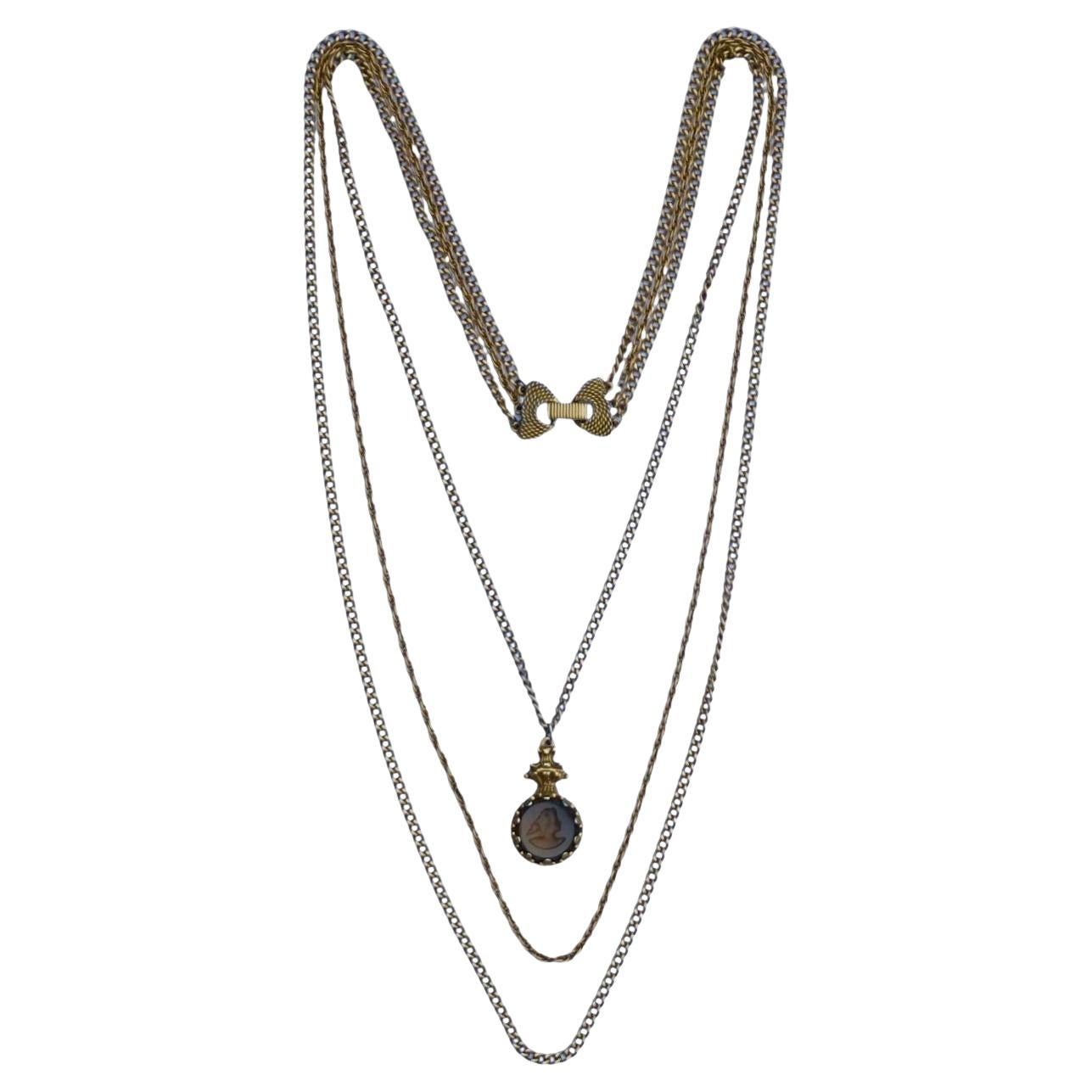 Goldette NY Gold Plated Three Strand Chain Necklace Intaglio Glass Cameo Pendant