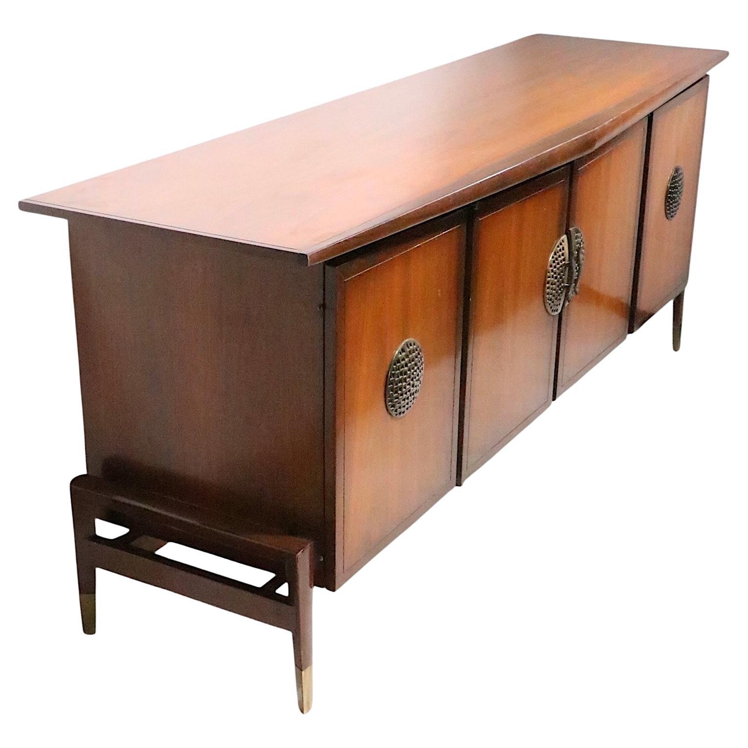 This gorgeous walnut credenza was designed by Helen & Hobey Baker in the 1950's. This piece has all the fun aspects of a true bold mid century modern piece -- clean, angular swooping lines that give the piece an almost googie look that is unmistakably mid century modern. The legs stand-off on the sides of this piece and also feature hits of brass detailing that are an echo of the large circular brass disks along the midsection of the piece. The brass pieces feature asymmetrical detailing that is almost chinoiserie feeling.