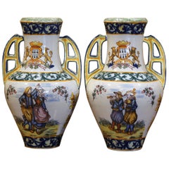 A set of two of French faience vases by Henriot Quimper, hand-painted with a man and woman depicted in traditional country attire in a pastoral setting. The reverse side each vase ha...