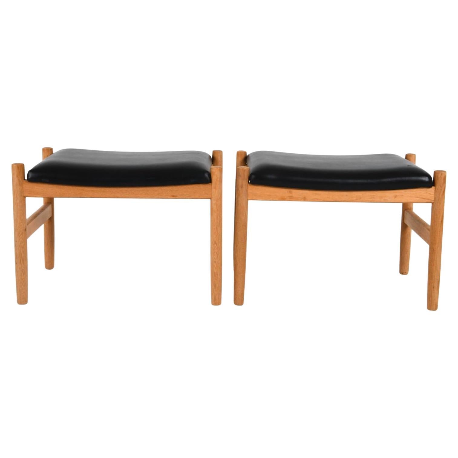 Pair of Danish Modern Oak and Black Leather stools by Hugo Frandsen for spottrup. Oak frames with black leather upholstery. Made in Denmark circa 1970.