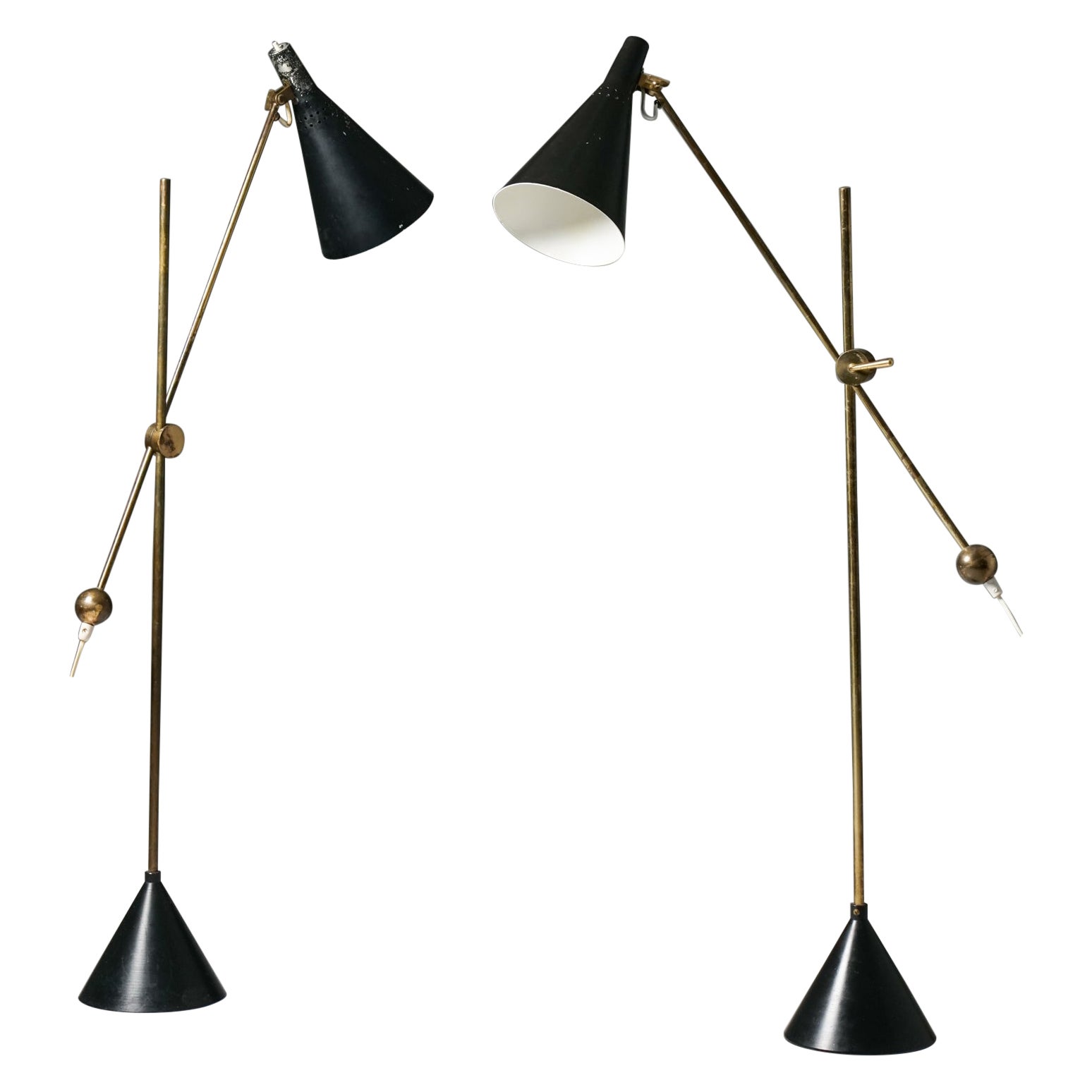A beautiful pair of the iconic Paavo Tynell floor lamps, model 9602, also known as the “Chinese Hat.” Originally designed in the 1930s, this model remains one of Tynell’s most celebr...