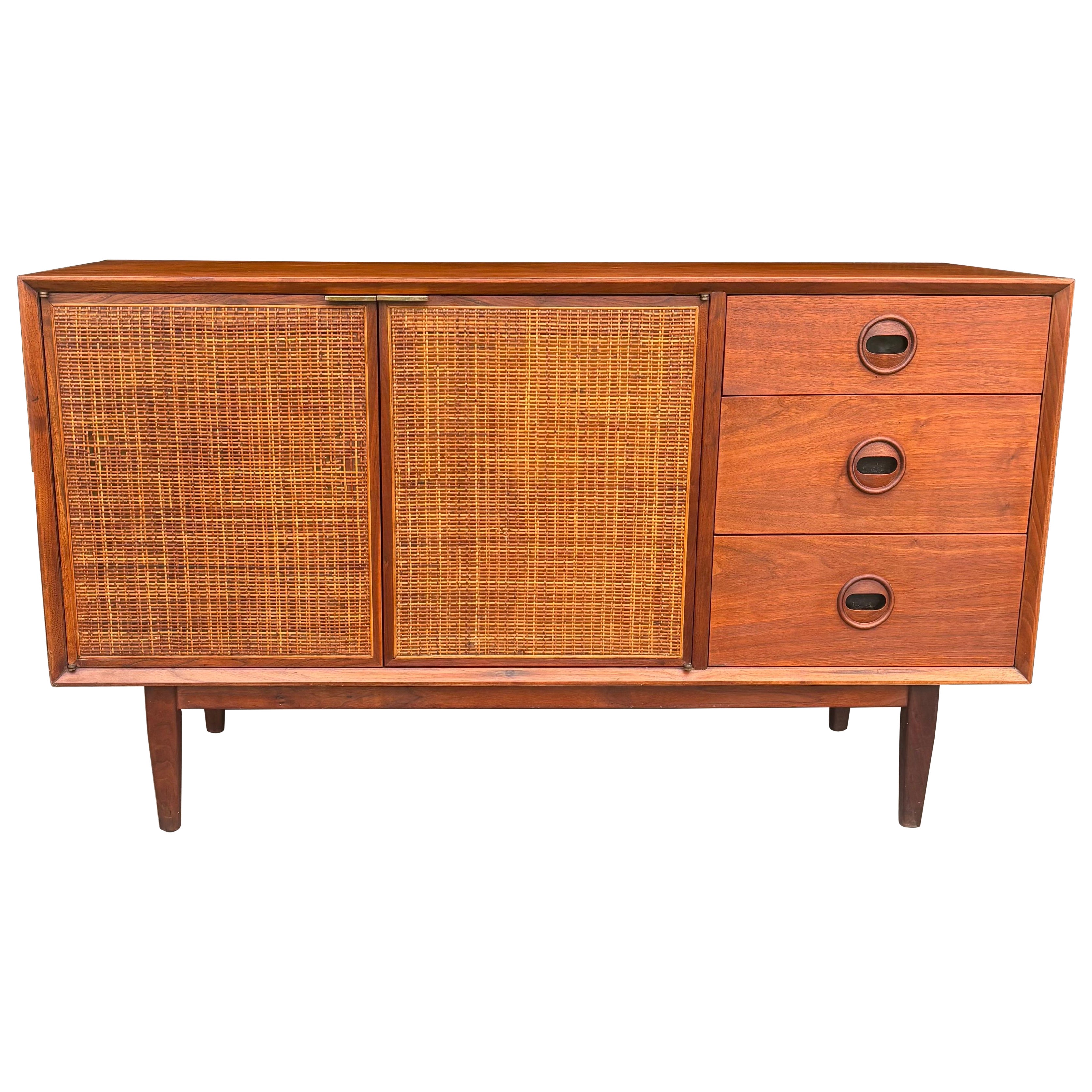 Mid century walnut and cane bar cart on casters by Jack Cartwright Founders