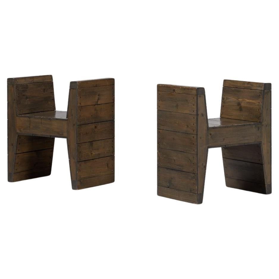 Designed in 1964 by Jan de Jong for the Sint-Willibrorduskerk in Almelo, this rare pair of wooden H shaped stools stands as a quiet yet powerful testament to the ideals of the Bossch...