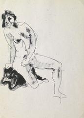 Radiant ink and charcoal painting of a nude female figure seated on a stool in a rich rust hue, circa 1960.
