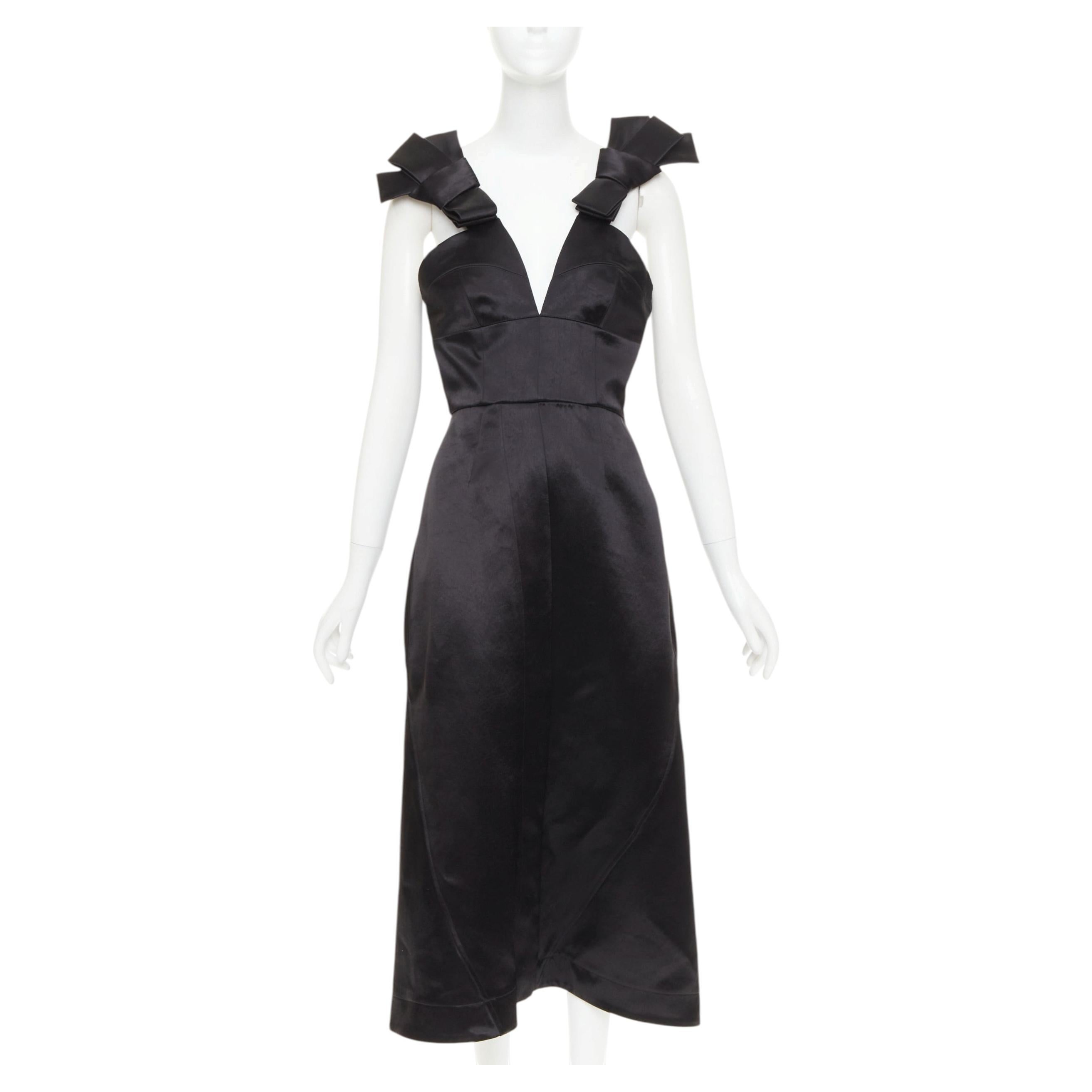 JIL SANDER black shiny satin bow detail V-neck sleeveless midi dress FR38 M