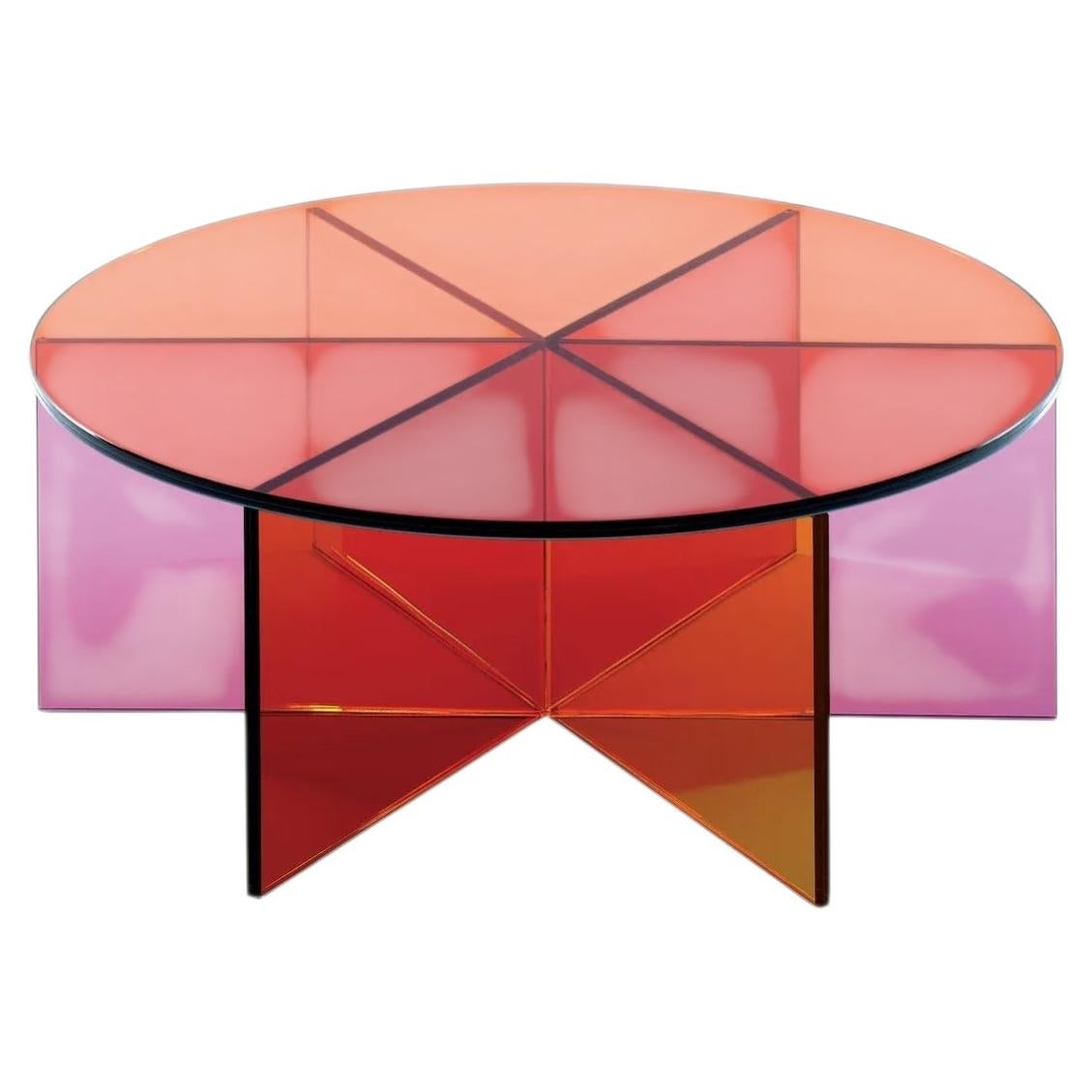 Collection of high tables, low tables and console, made in multi-layered and multichromatic glass, created by laminating five slabs of 5mm extralight glass each with a different colored film. The obtained glass sheets are in different shapes, shiny ground polished and “faceted” by means of unique bevels accentuating through the transparency of the glass the stunning multicolored material. The different components are then welded together in total clarity, by means of a special gluing technique, so creating very precious “furniture jewels”. Available in green or ochre finish.