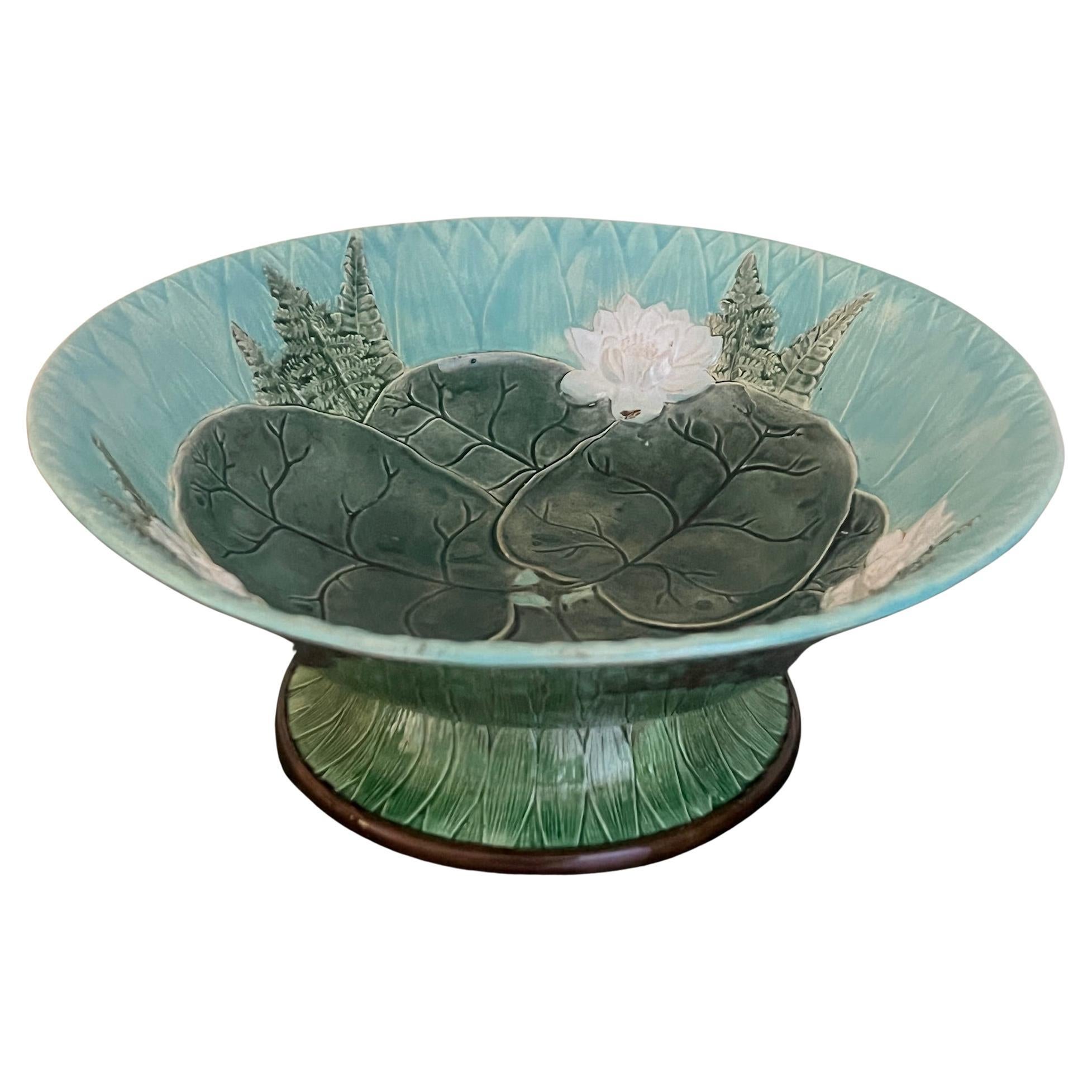 19th Century footed majolica bowl made in England by Joseph Holdcroft. The bowl has green reed leaves covering it's footed base with pond lily leaves at the center over a turquoise ...