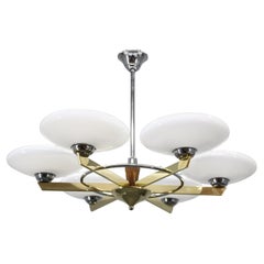 Six-light "Tetraclio" chandelier by Sergio Mazza for Artemide, 1960s Made of nickel-plated brass and blown opaline glass. Intact and in good condition. Height 100 cm, diameter 55 cm...
