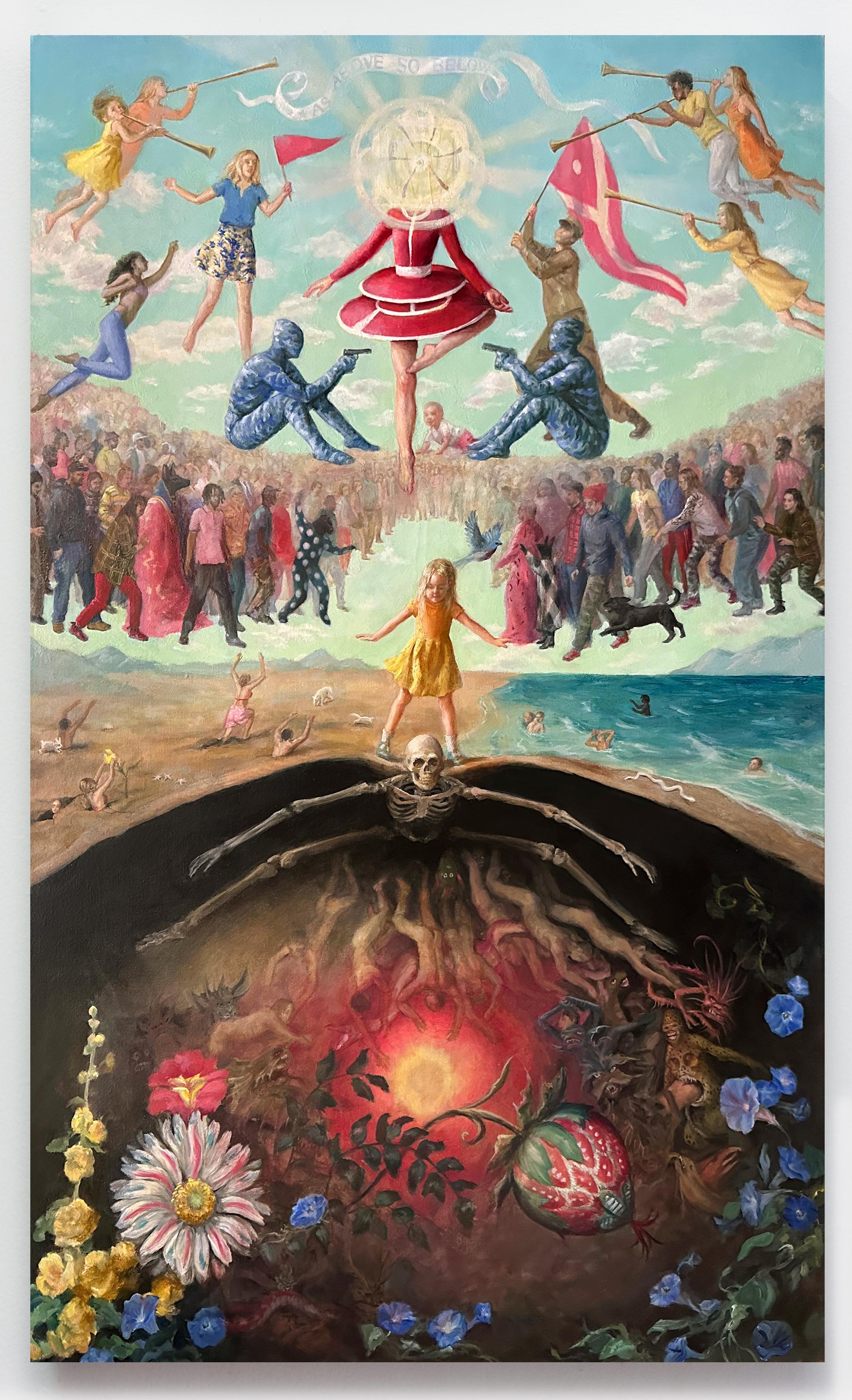 A contemporary oil painting that resembles an early renaissance mural. Old masters throughout Art History come to mind, like Hieronymus Bosch, Jan Van Eyck, or Pieter Bruegel.