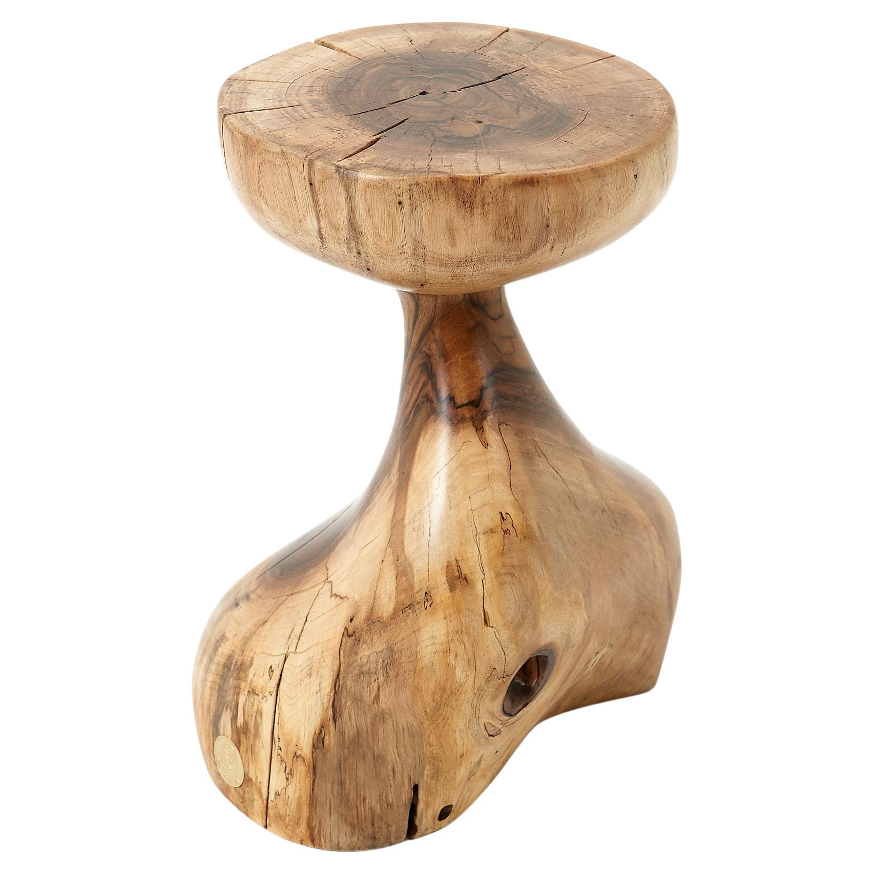 This unique side table or stool is a one-of-a-kind functional sculpture, carved from a single piece of wood to highlight its organic character and structural permanence. Its form fea...