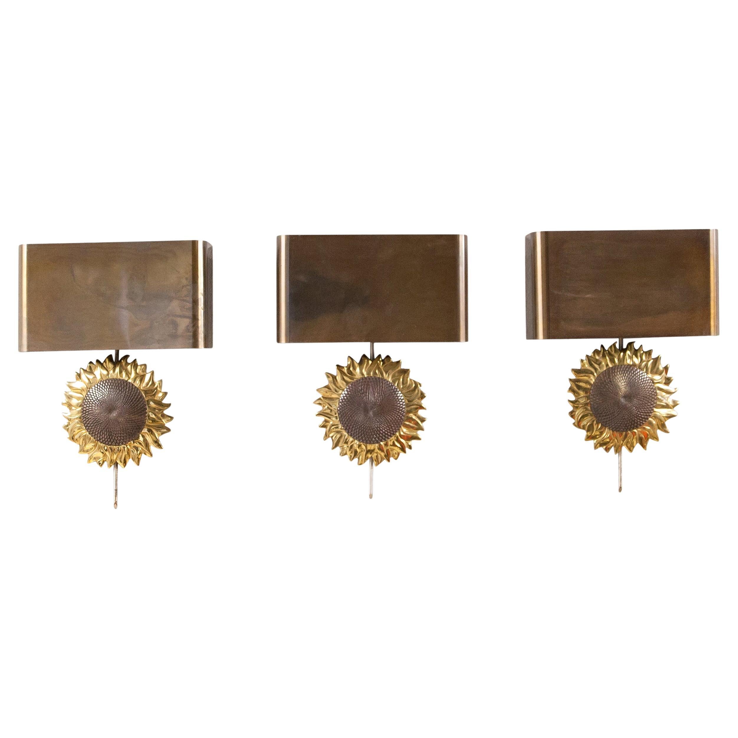A beautiful set of three MId- Century "Cattails" bronze light fixtures by Maison Charles, France, circa 1970s.