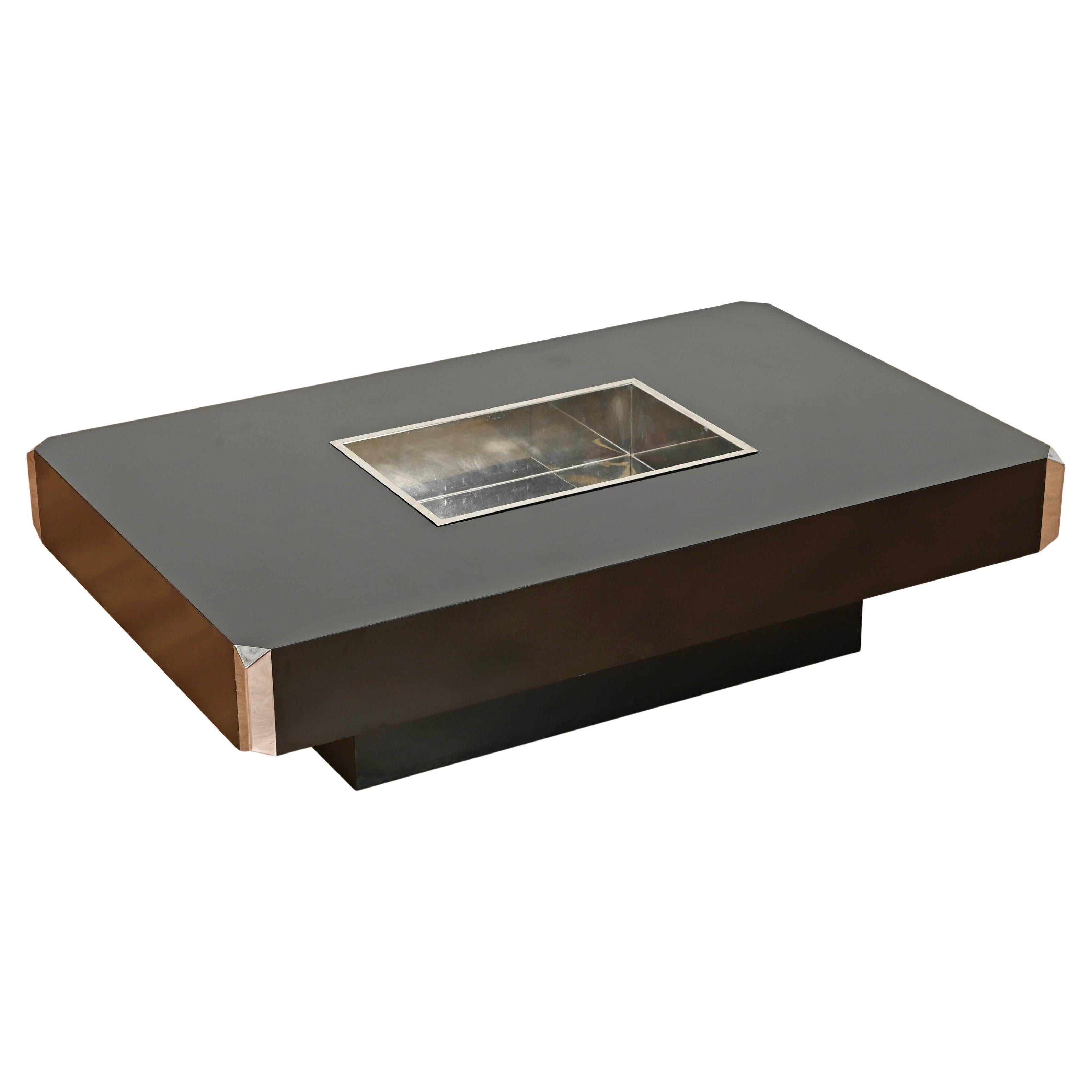 "Alveo" Rectangular Burl and Brass Coffee Table by Willy Rizzo, Italy 1970s