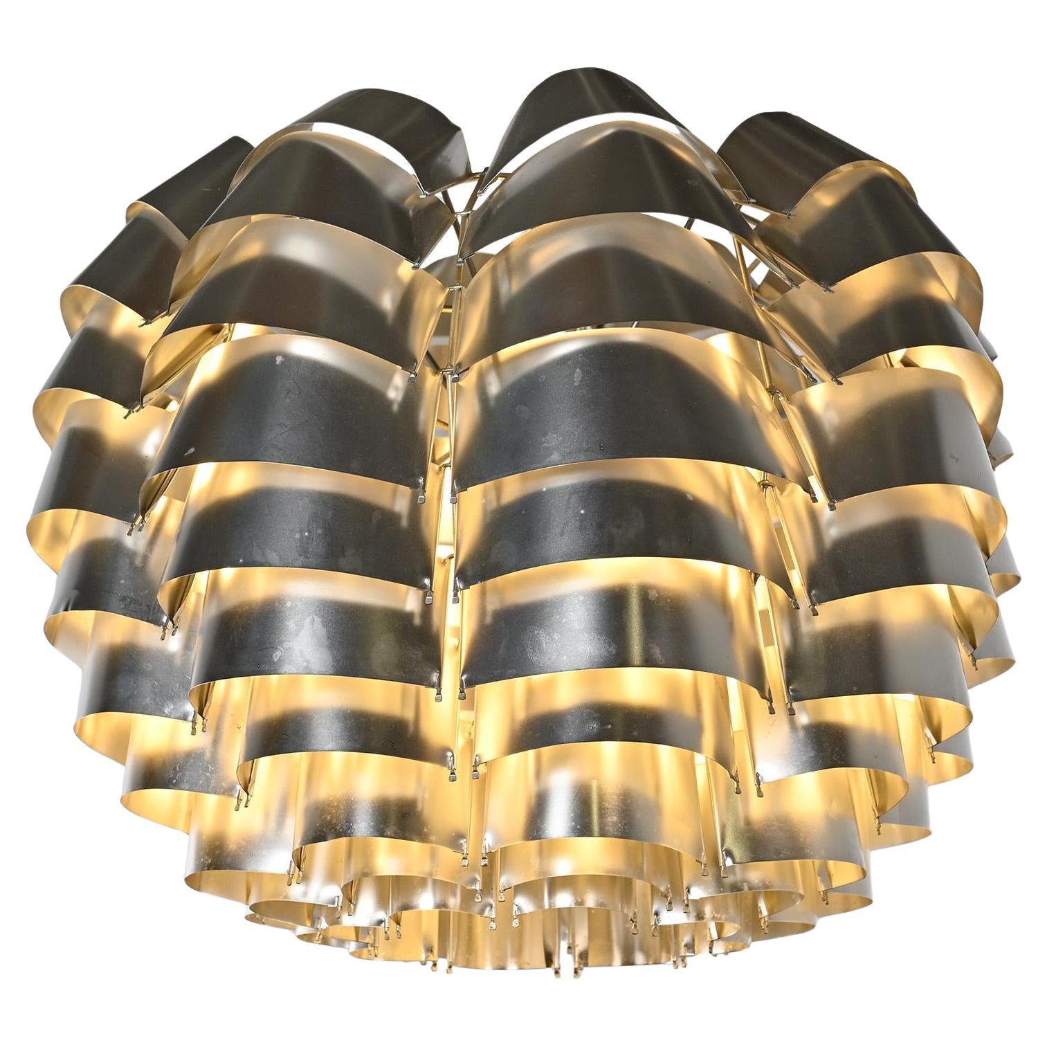 Space age pendant light with bent aluminum strips in silver and gold.