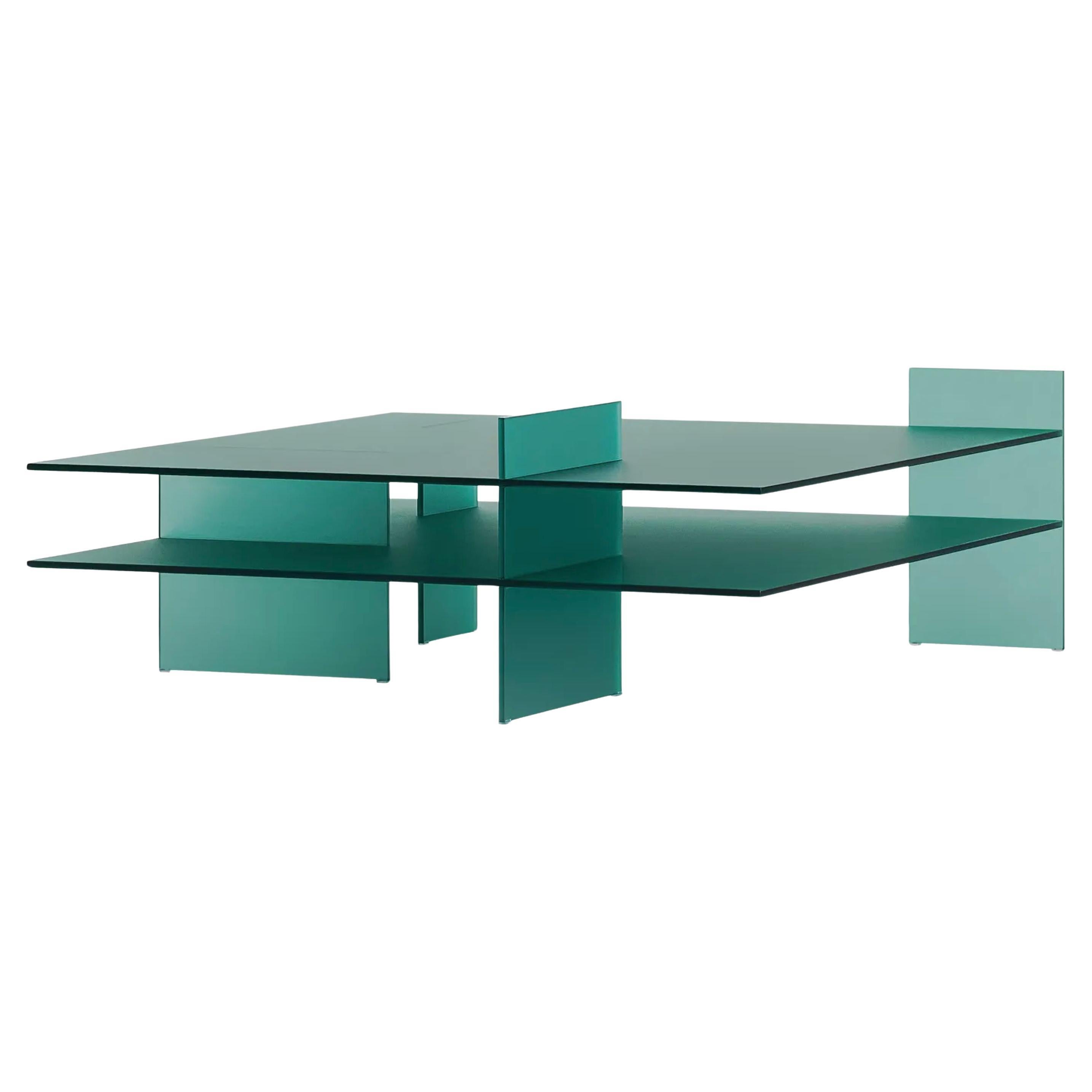 Collection of furniture consisting of shelves, console and low table, completely made of a special 10 mm tempered double-sided green acid-etched glass, or, in 6+6 mm laminated doub...