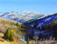 Michelle Condrat's oil painting "Snowy Foothills" is an original, handmade oil painting that depicts foothills of fall colors covered with patches of snow.