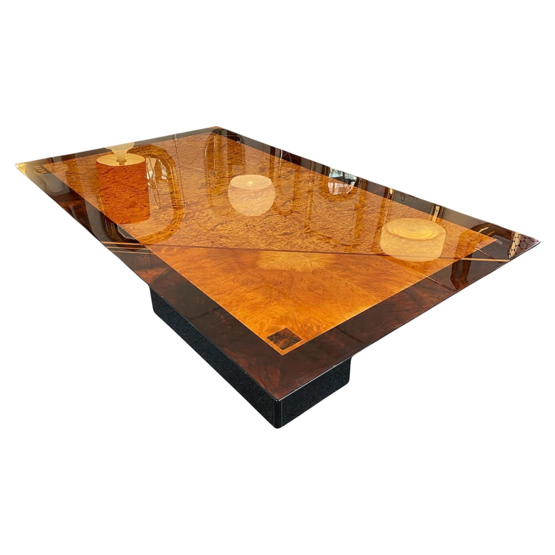 This high coffee and side-table comes with a base and top in Canaletto walnut, natural ash, ash stained black, intense blue or anthracite. The structure's body is made out of blown Murano glass, available in amber, blue-grey or smoke grey. Here you are shown the Mastea coffee table in the Canaletto walnut base finish and in the high size. If you are interested in the natural ash, ash stained black, anthracite ash or Intense blue base structures.