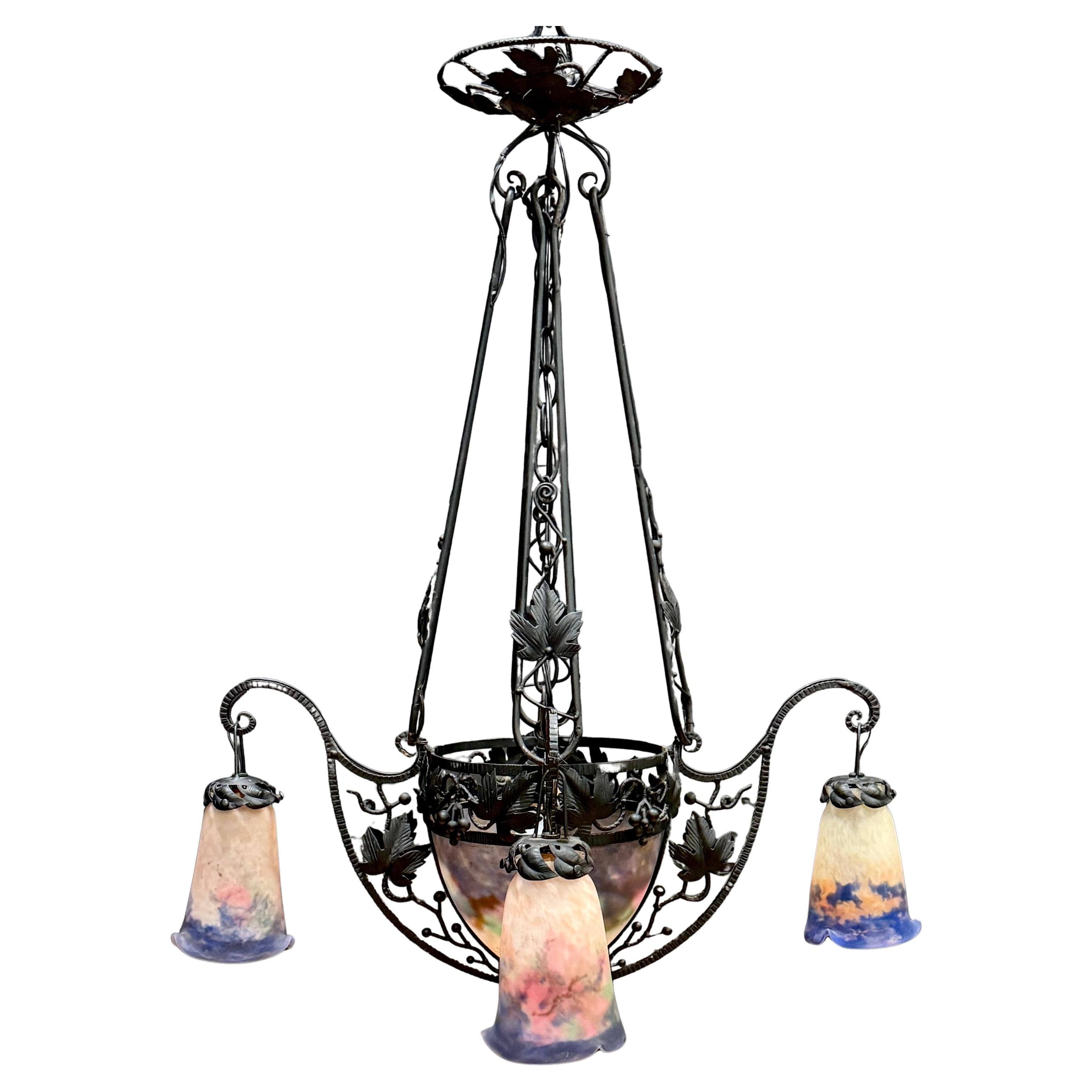 An exceptional signed Muller Frères Luneville Art Nouveau chandelier featuring a masterfully hand-forged wrought-iron frame adorned with naturalistic vine and leaf motifs. The fixtur...