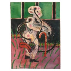 Charming French gouache on kraft paper, circa 1970. A stylised and naïve portrait with warm, earthy tones, set in its original wooden frame. The simplified forms and graphic constr...
