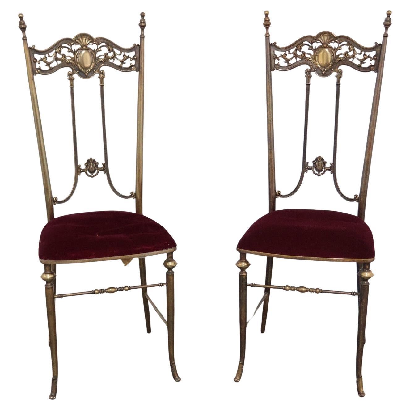 Bellissima Coppia di sedie Chiavarine di Pierluigi Colli in ferro battuto e foglia oro con rivestimento in gomma piuma e velluto rosso, ritappezzate. ...