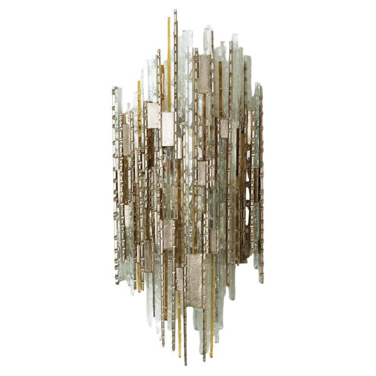 Large Brutalist style Murano glass sconce designed by Albano Poli for Poliarte, Italy, 1970s. Composed of several rectangular and elongated pieces of whitish translucent Murano glass...