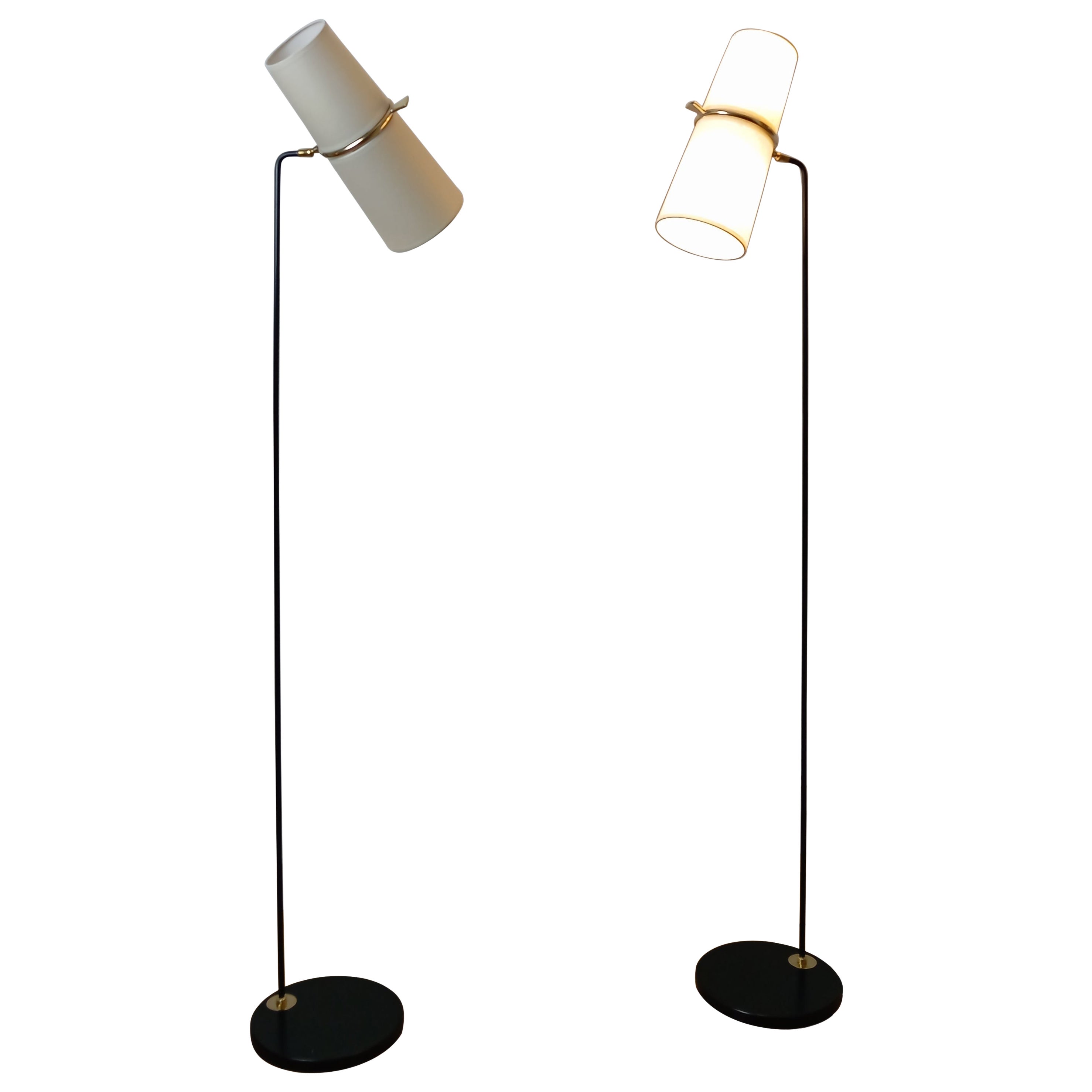 Brass floor lamp, consisting of a black lacquered circular base, set with a brass ring, on which a brass light arm is arranged, adjustable from left to right by means of a brass ball...
