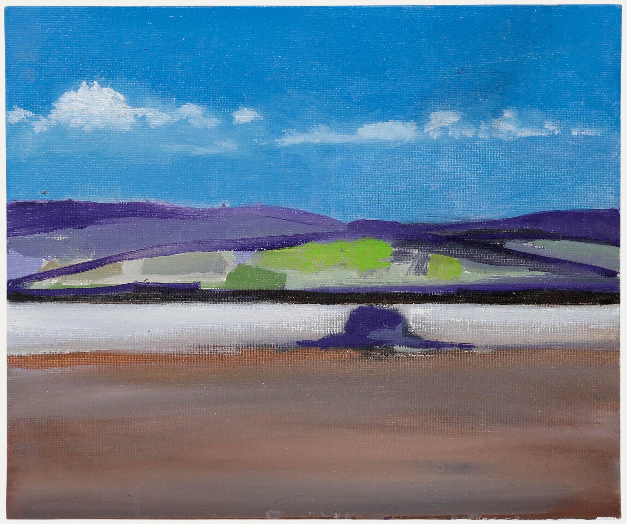 A charming landscape by Richard J.S. Young. An inscription on the reverse side of the board identifies the location as the Severn estuary, looking towards Wales. Unsigned. On board. ...