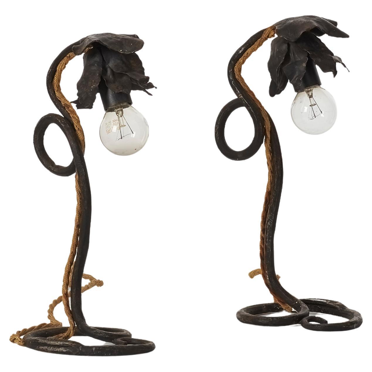 A pair of matching table lamps. The pieces’ delicate petals catch the light with subtle texture, while the looping bases anchor the works with confident gesture.