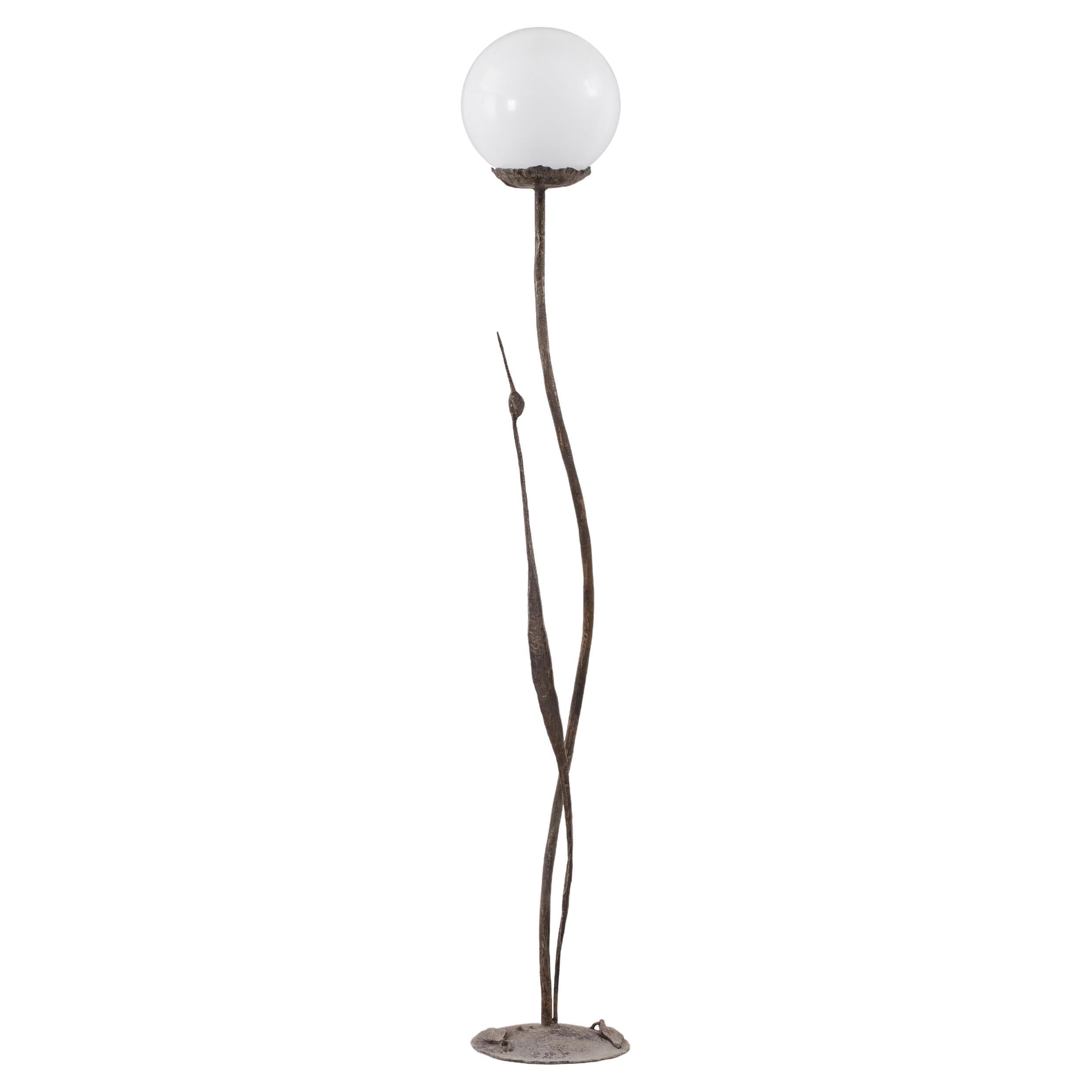The floor lamp is made entirely of burnished wrought iron. Present artist's stamp.