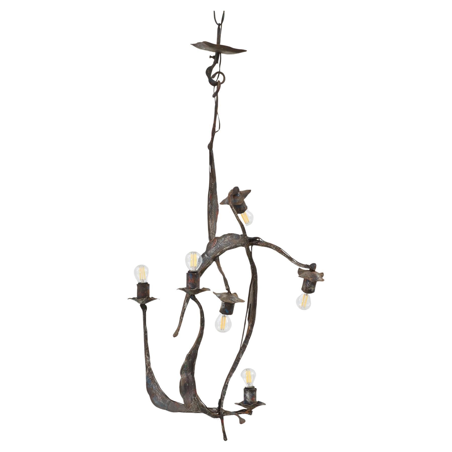 This wrought iron chandelier twists like living vines, its sculptural arms unfurling into six flower-like cups. The weathered patina enriches its organic form with depth and characte...