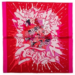 Antonio Castillo designed this lovely silk scarf for Jeanne Lanvin Paris in the 1950s. The design features graphic letters printed in blue, gray, and pink colors and is signed in the...