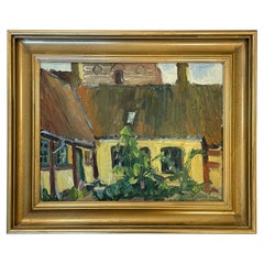 This is a Danish original vintage oil on canvas landscape painting by Børge Ball (1906-1979). The motive is a cow in the field with a woman approaching with a milk pail. In the backg...
