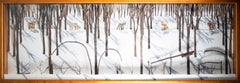 "Deadfalls" is an original mixed media construction by Tom Shelton. This piece features six rows of bare trees in snow and five animals.
