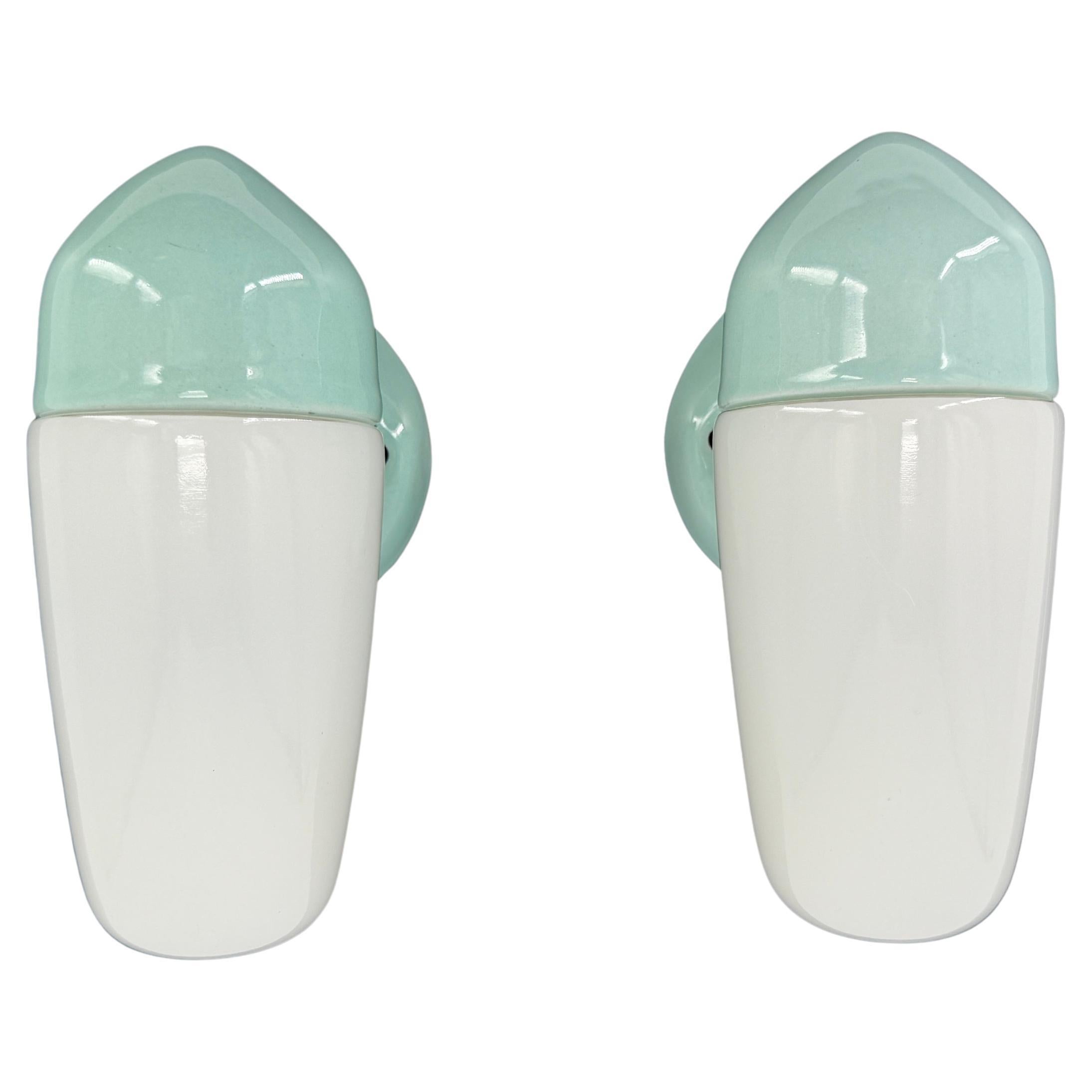 A Midcentury Modern double socket wall lamp/sconce dating back to the 1950s, designed by Wilhelm Wagenfeld. Its form resembles a zeppelin or cigar, crafted from porcelain with a white glaze and topped with two white opaline glass shades. Executed by Linder Wandleuchten in Germany, this piece offers two E14 light sources and is preserved in very good condition. The lamp has a built-in switch, but it can be easily removed if you prefer to use it without. It has been rewired for modern use. Ideal for various settings, it is especially well-suited for bathrooms or as a vanity mirror light.