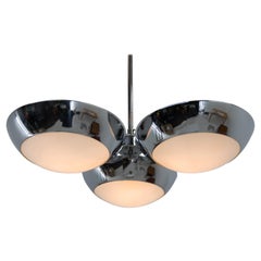 Rare Bauhaus-style chandelier produced by Zukov Czechoslovakia in the 1940s, marked with the original Zukov badge. This sculptural vintage fixture features three striking chrome-plat...