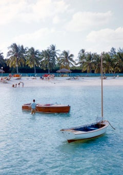 Gerald Berghammer - Farbfotografie. Mehrere bunte Kokosnussboote liegen an einem Sandstrand mit spärlicher grüner Vegetation, ruhiger See und bewölktem Himmel. Pigmenttintendruck in ...
