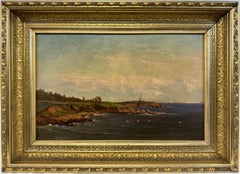 Original blaues Ölgemälde, das den Sonnenuntergang über dem Vätternsee von Vadstena aus zeigt