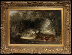 Eine stimmungsvolle Dämmerungsszene von Alessandro Altamura, die einen ruhigen, lebhaften Fluss darstellt, der wahrscheinlich in der Nähe der Waldlandschaft von Fontainebleau in Fran...