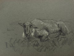 British Chalk Pencil Sketch of Small White Sheep Lying Down