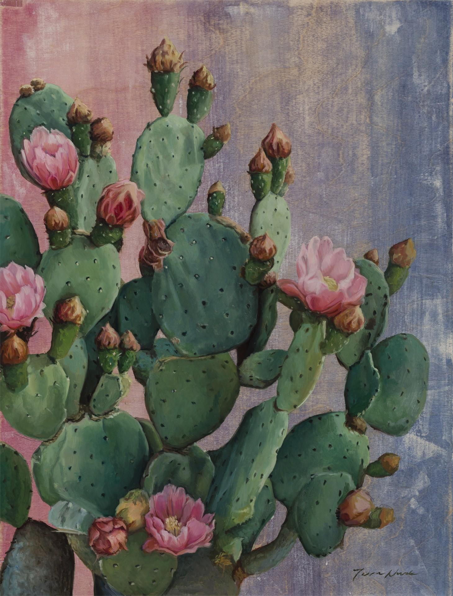 Kakteen, Blumen, Berge und Sonne - eine Kombination aus Stärke und Zärtlichkeit, Überleben und Schönheit, Licht und Stille. Dieses Gemälde strahlt Wärme, Freiheit und natürliche Harm...