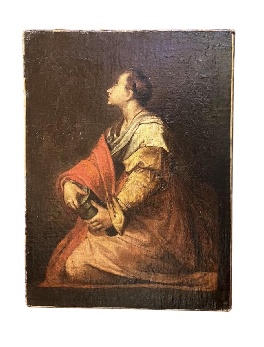Antikes Ölgemälde einer jungen Frau in Landschaft, Picknick auf den Feldern